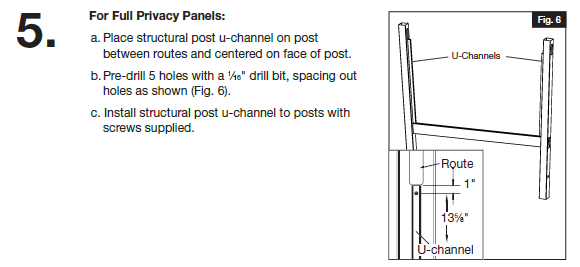 Vinyl privacy fences use interlocking tongue-and-groove pickets that slide into horizontal rails. The U-channel holds these pickets snugly against the posts, providing crucial vertical support.One of the biggest installation mistakes we see is when the U-channel isn’t secured to the post. We include six screws (three per side) for every panel to make sure the channel is anchored properly. This small detail makes a big difference in how your fence holds up over time.
